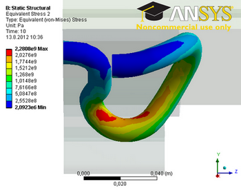 ANSYS Workbench umožňuje analýzu řady výsledků, např. ekvivalentního napětí nebo deformace v jednotlivých rovinách. Obrázek vpravo ukazuje grafické znázornění rozložení napětí v pružné svěrce, podobně je možno získat výsledky ostatních částí železničního svršku - pražce, kolejnice či podložky pod patou kolejnice.