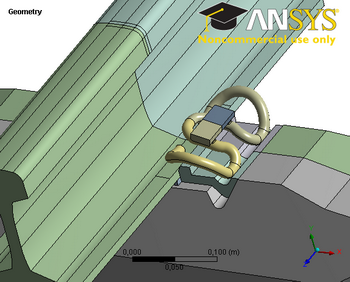 Upevnění kolejnice k pražci významně ovlivňuje vlastnosti celého železničního svršku. Cílem práce byla analýza systému upevnění s důrazem na chování pružné svěrky Skl 14. Prvním krokem je vytvoření geometrického modelu, který co nejvíce odpovídá reálné situaci. Geomterický model systému upevnění je na obrázku vpravo.